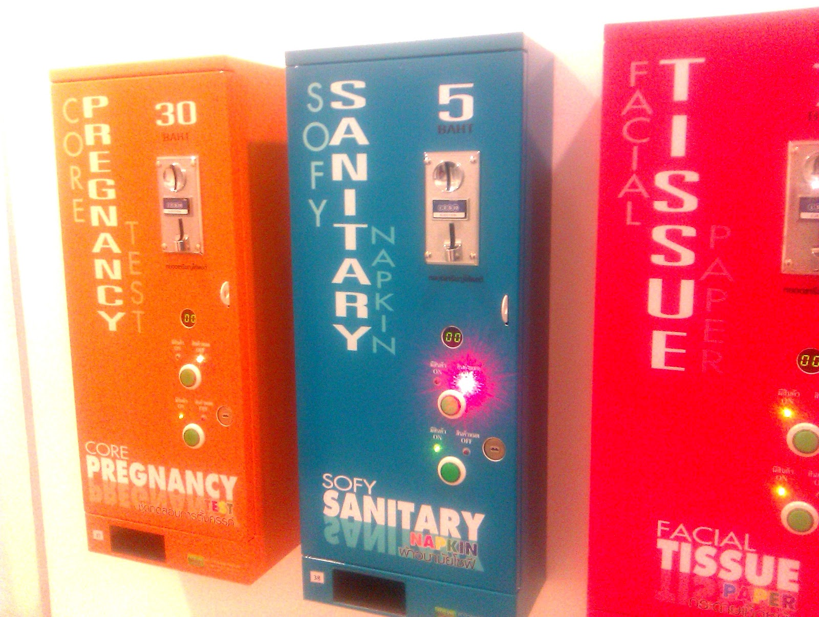 | Das Beste (und Irritierendste) zum Schluß: Hier haben wir uns bekannte Toilettenautomaten. Nützliche Hygieneartikel, die man oft mal braucht, aber gerade nicht dabei hat. Diese thailändischen Automaten fallen aber nicht nur wegen ihren entzückenden Farben auf. Der rote Automat spendet Gesichtstücher, bei großer Hitze sicherlich nicht schlecht. Der blaue Autmat liefert Binden, auch das ist etwas das man durchaus öfter mal braucht. Last but not least, ein Automat den man ganz sicher ständig, mehrmals täglich, vielleicht sogar stündlich nutzen kann: Orange bietet SCHWANGERSCHAFTSTESTS. Ob das in direkter Korrelation mit dem Sextourismus steht, sei dahingestellt. |